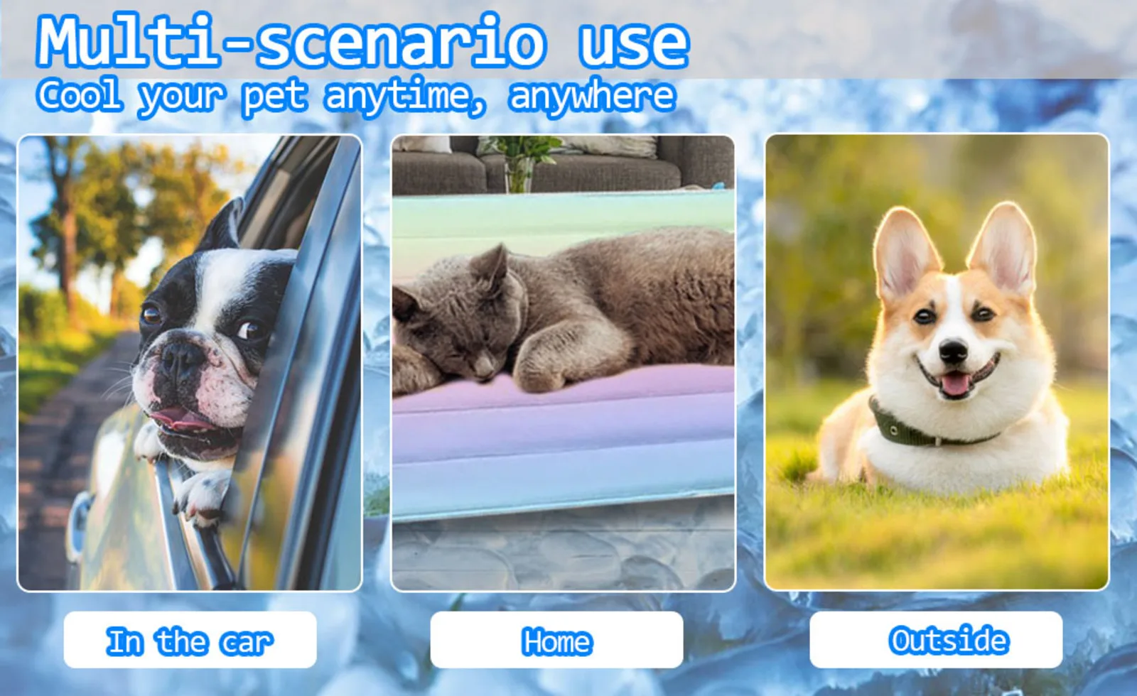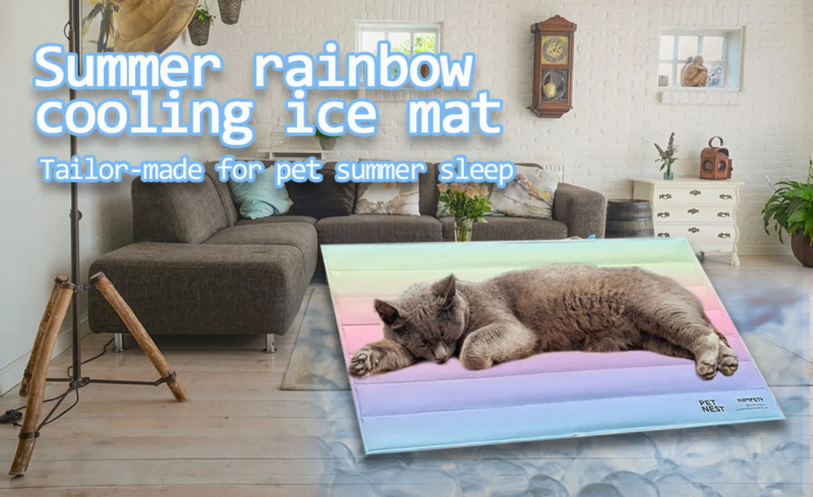 Gel-infused cooling pad with vibrant rainbow design—weighs only 2800g, folds for travel, and wipes clean instantly. Perfect for hot days!