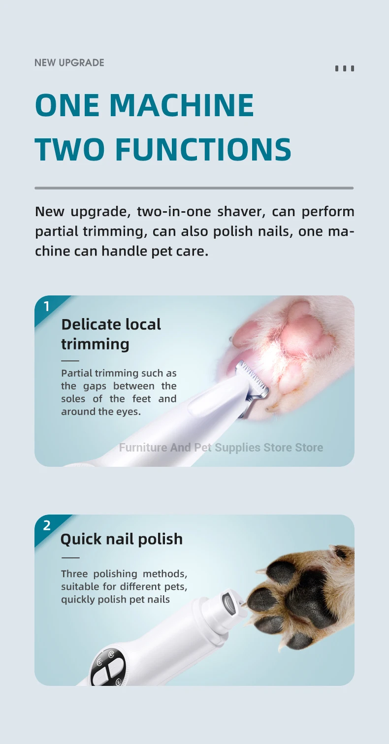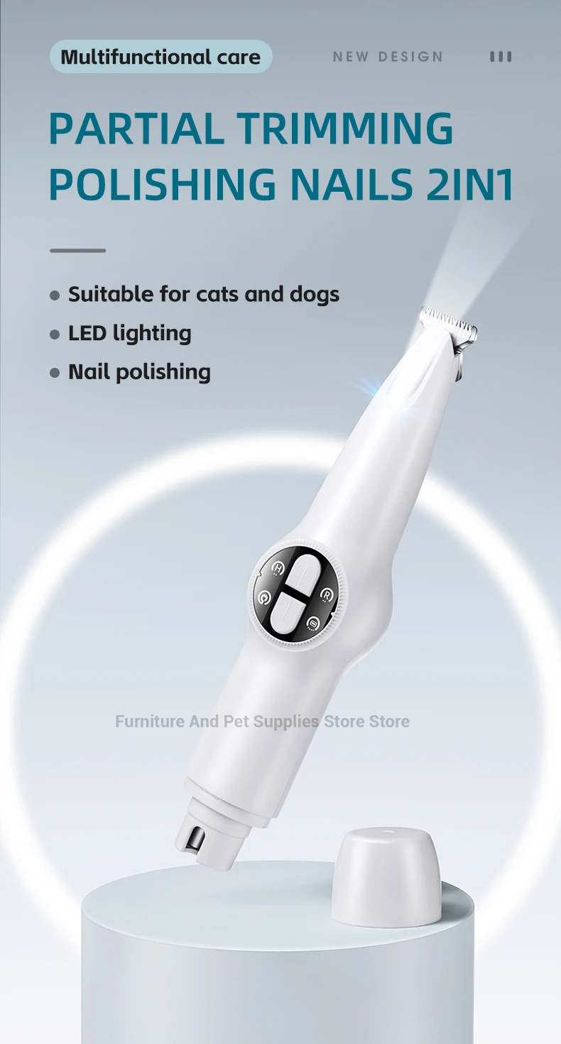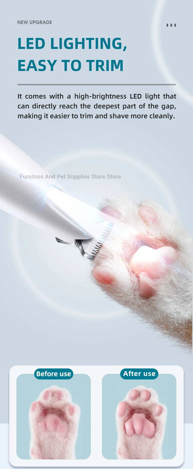 Low-noise pet grinder with 3 speeds, LED light, and 0.7" wide head. Safely trims nails, paw pads, and fur around eyes. USB rechargeable.