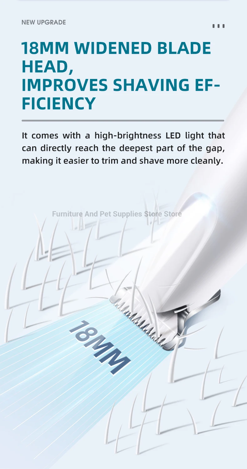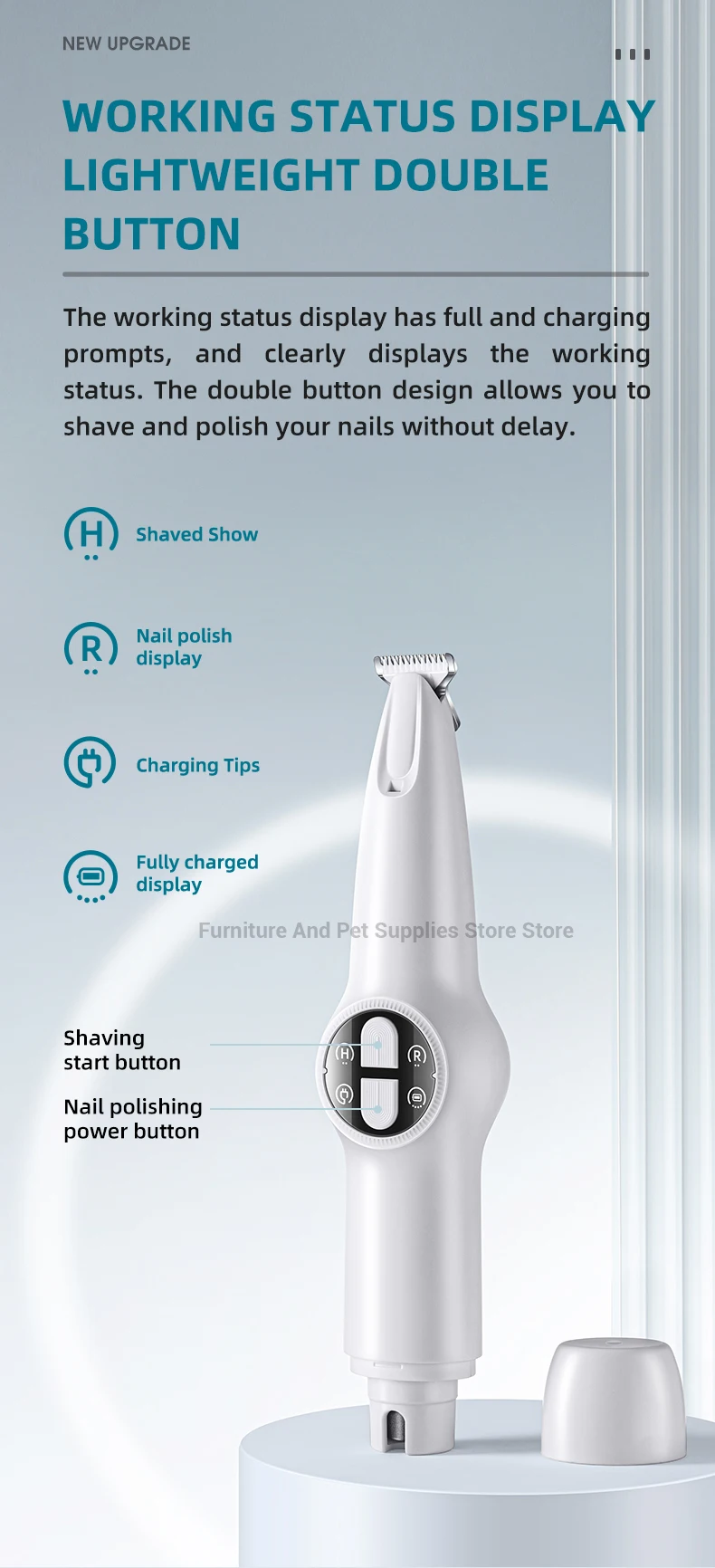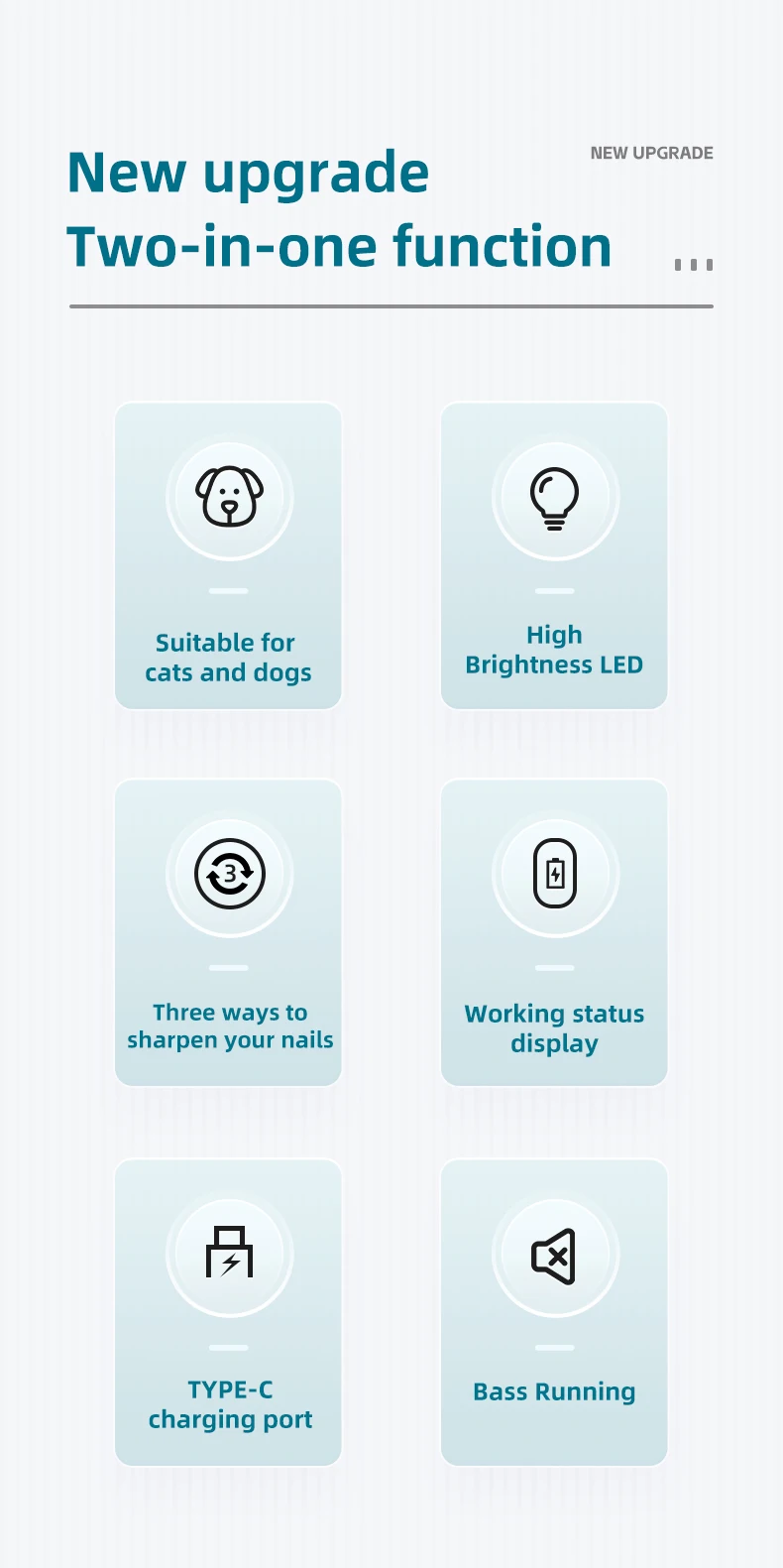 Low-noise pet grinder with 3 speeds, LED light, and 0.7" wide head. Safely trims nails, paw pads, and fur around eyes. USB rechargeable.